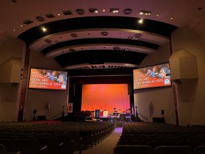 - Audio: The audio system featured Meyer Sound ULTRA-X42 loudspeakers, providing clear, even coverage throughout the space. 900-LFC Subwoofers offered deep low-end reinforcement, while under-balcony fills ensured consistency across seating zones. An Allen & Heath SQ-7 console with stage box integration handled mixing duties, supported by Shure wireless microphones and IEMs. OFE (owner-furnished) Ace Backstage stage pockets were also utilized for streamlined on-stage connectivity and clean cable management.