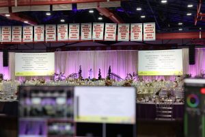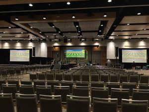 - Video: The video system featured a stage-mounted DVS 2.9mm LED wall with Novastar processing and a Blackmagic video switcher. SDI lines were distributed throughout the facility. OFE Apple Mac Studio and ProPresenter supported the control and presentation workflow.